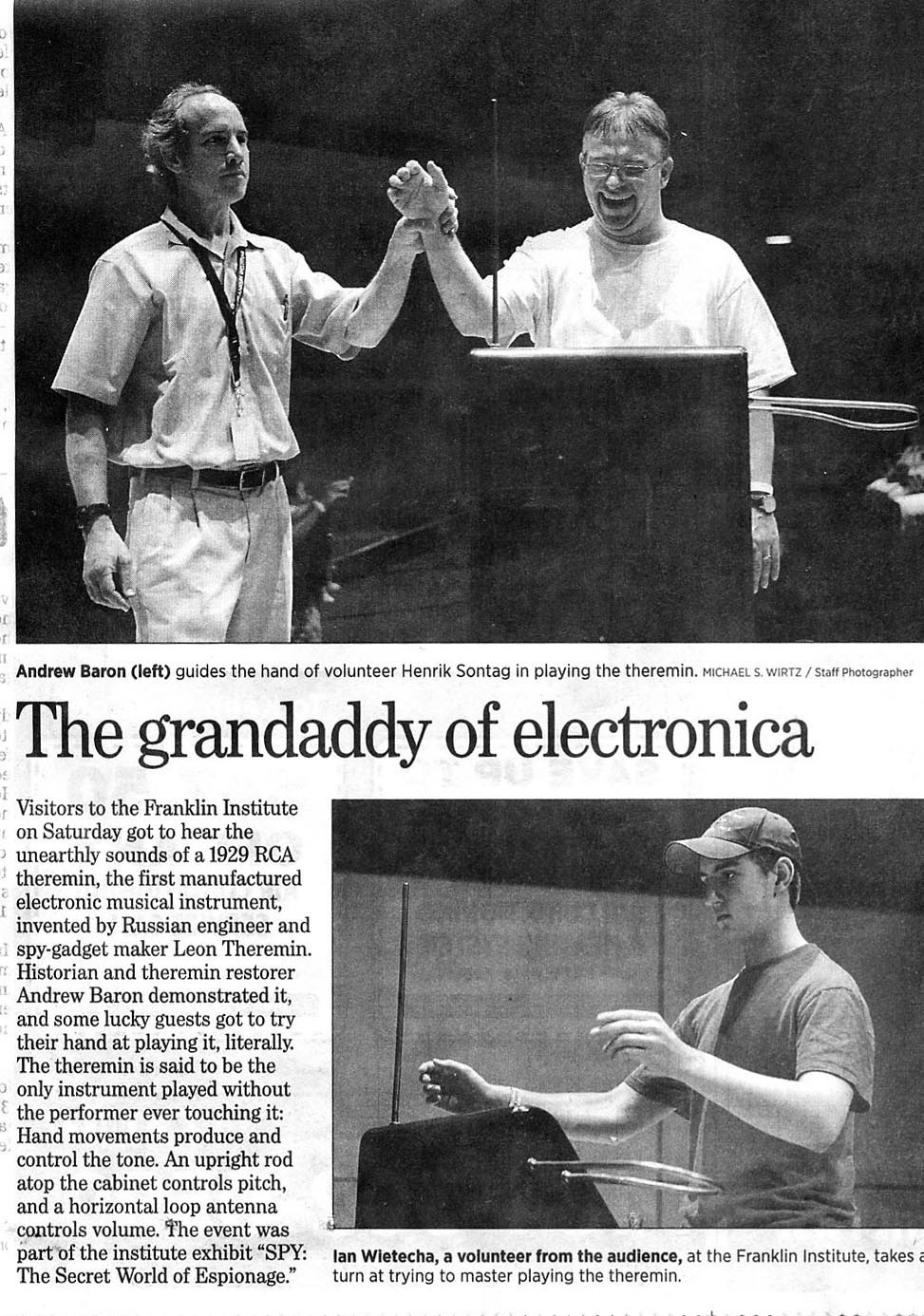 In April 2007, restoration of the theremin was conducted in Philadelphia at the museum. The preliminary inspection revealed a power supply with a dead short, and numerous broken and disconnected wires throughout the instrument. Humidity had taken a toll on the internal electrical contacts as well, and these were fully reconditioned prior to completion of the repairs and final adjustments. This theremin rewarded our efforts with one of the sweetest voices we've yet encountered in a stock RCA, in addition to an extraordinary pitch range of more than five octaves. The ideal waveforms that this instrument produces can be seen on our Sound, Tone, and Tube Advice page. The theremin was demonstrated on 29 June, 2013 as part of the exhibit “SPY: The Secret World of Espionage”.